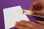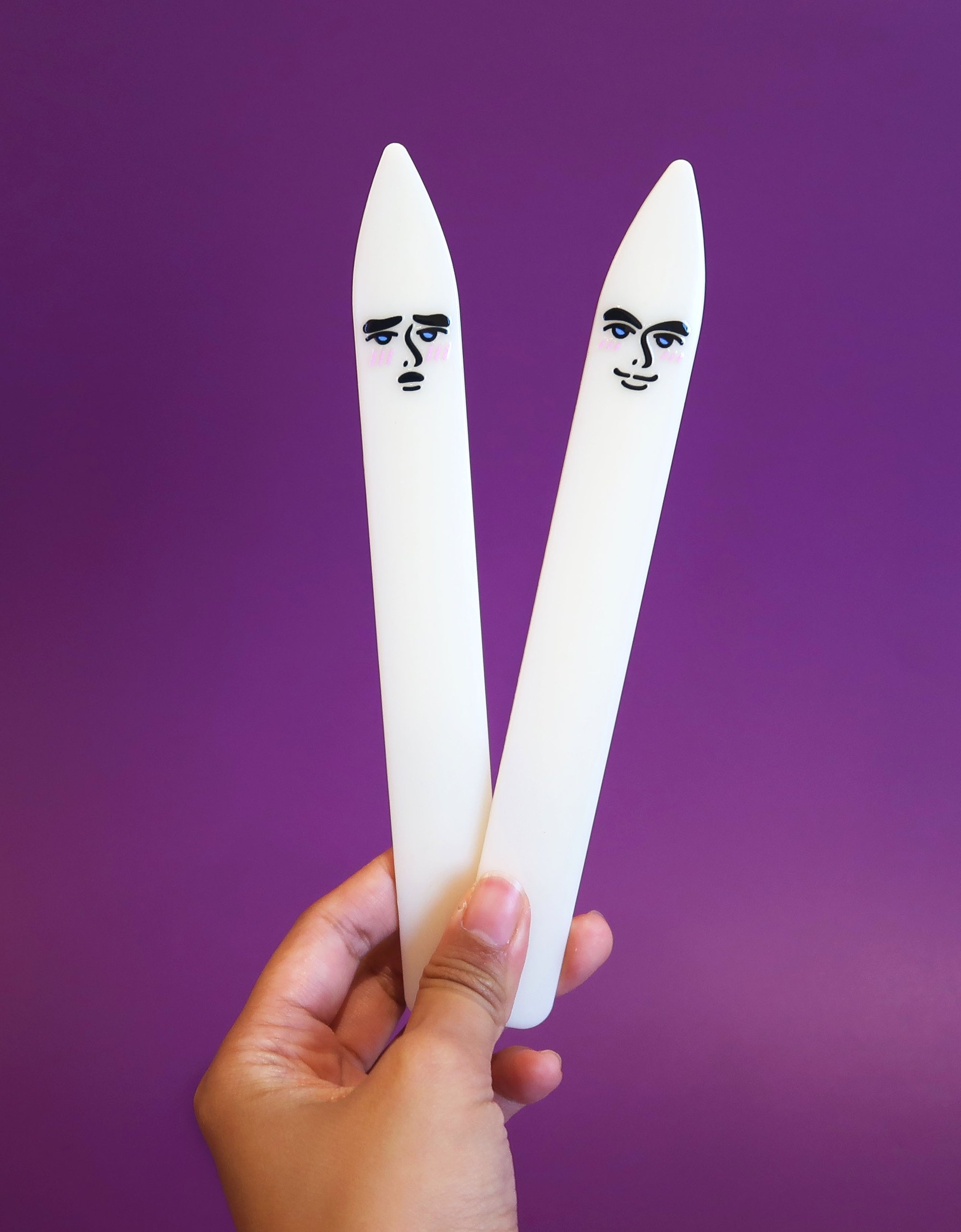 A fun and handsome bone folder to help you fold your zines, cards, pamphlets, and all your paper crafts! Each bone folder has a UV sticker of a bishounen face on one side and a flustered face on the other. All these are applied by hand!