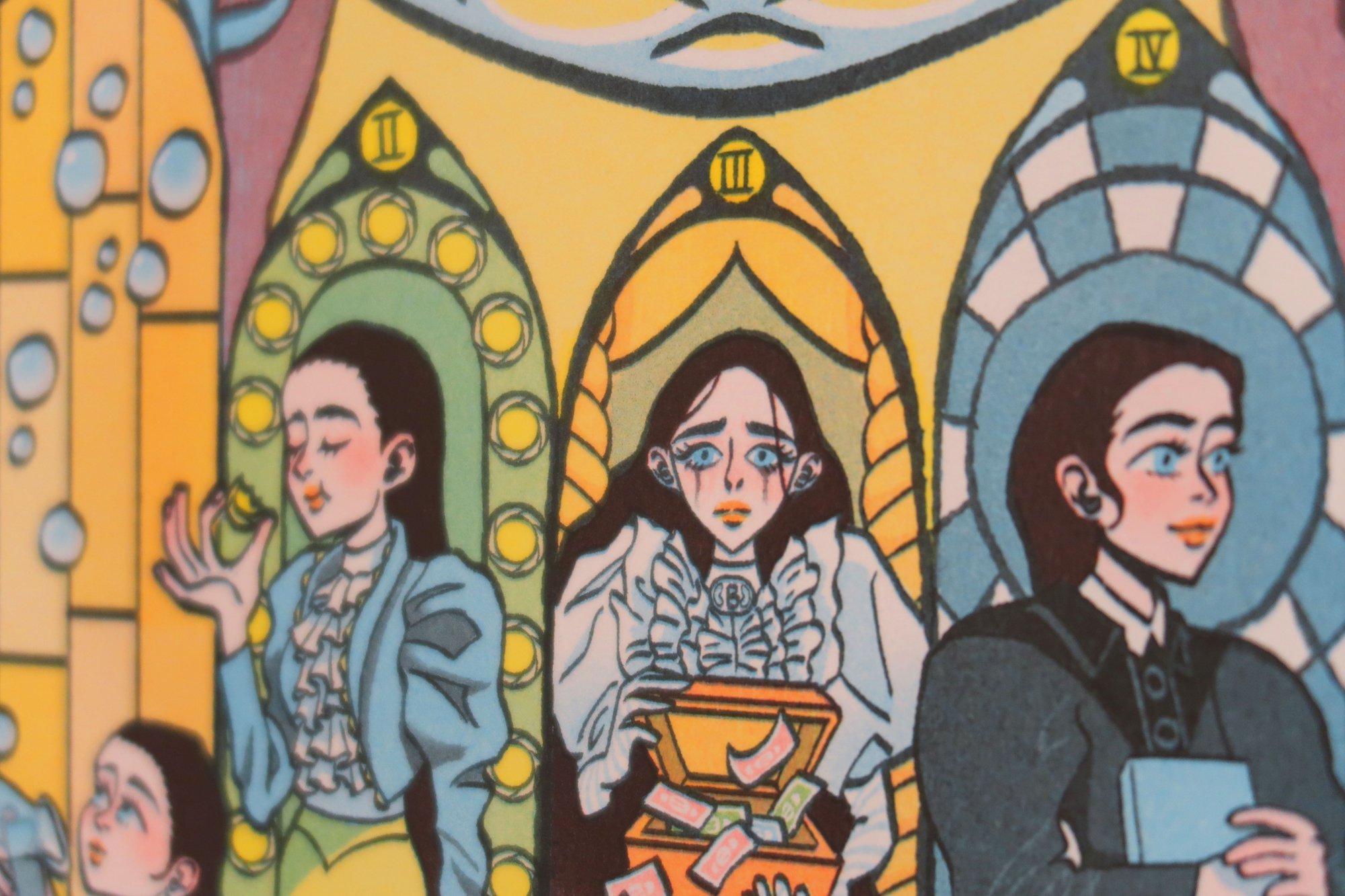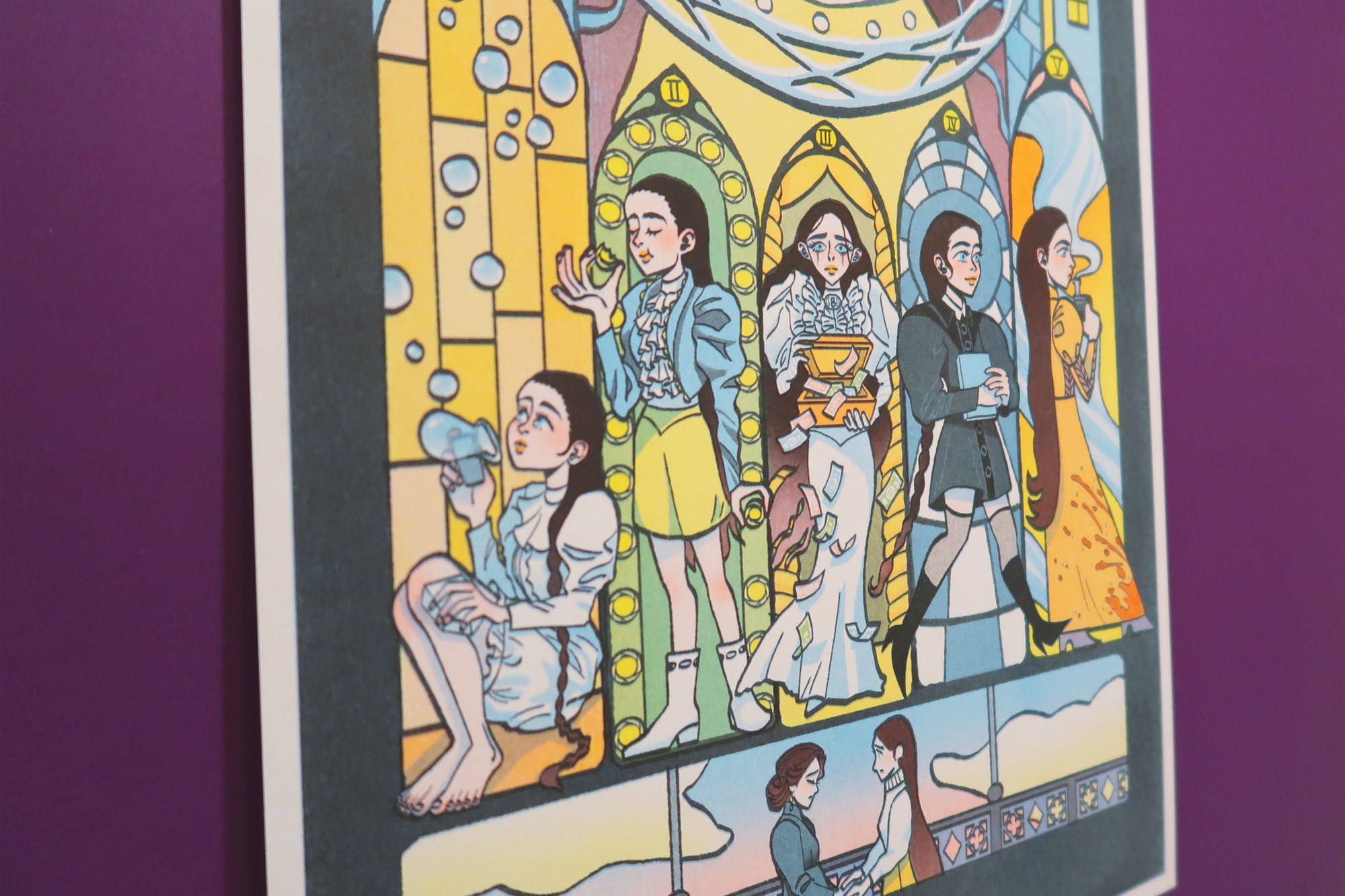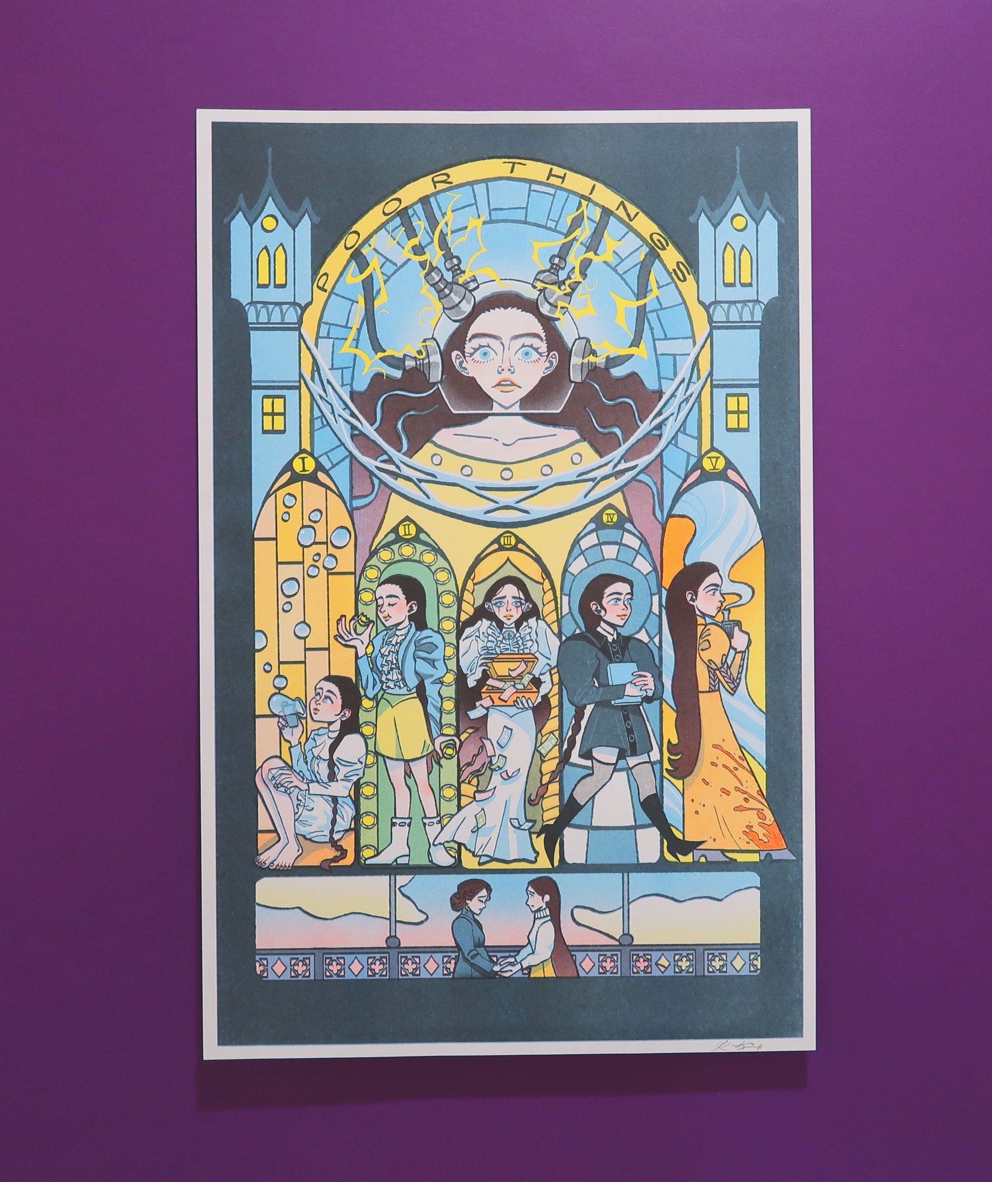 I absolutely loved poor things! I was inspired to make a stained glass design showing Bella's growth and outfit from every chapter of the film.